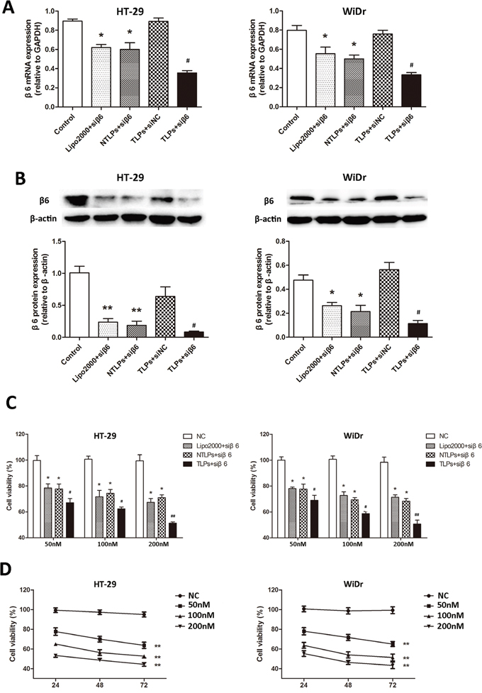 In addition, we examined the integrinβ6 protein expression by western blotting. HT-29 and WiDr were treated as described above. It was also notable to see in Figure 3B that β6-siRNA in TLPs was more likely to inhibit the β6 expression than both Lipo2000 and NTLPs. In consistence with the result of PCR, Lipo2000 and NTLPs had an equal activation of β6 expression suppression. The β6 scrambled siRNA in TLPs had no effects on the expression of integrinβ6.