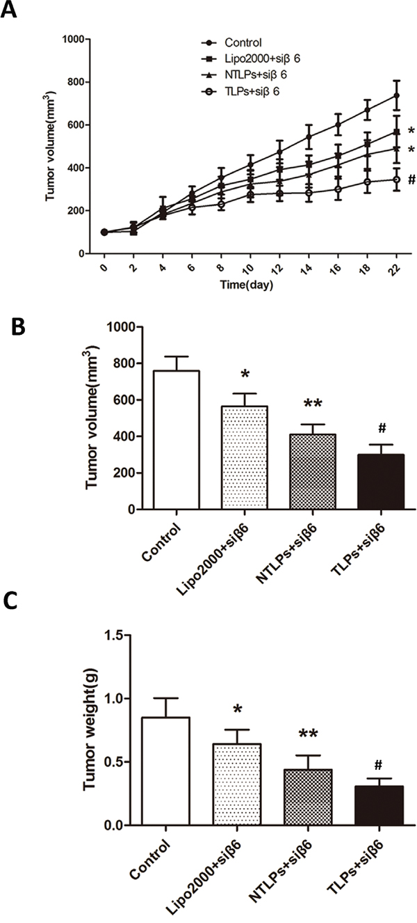 Figure 6: In vivo anti-tumor study of liposomes in HT-29 tumor-bearing nude mice after intratumor injection with β6-siRNA loaded Lipo2000, NTLPs and TLPs. The dosage β6-siRNA was 0.4 mg/kg. A. Relative tumor volume time curve (n=5), *P < 0.05 compared with control, # P < 0.05 compared with NTLPs. B and C. After 3 weeks, the mice were sacrificed and the tumors were dislodged. Tumors were also measured and weighed. (n=5), * P < 0.05, ** P < 0.01 compared with control, # P < 0.05 compared with NTLPs.