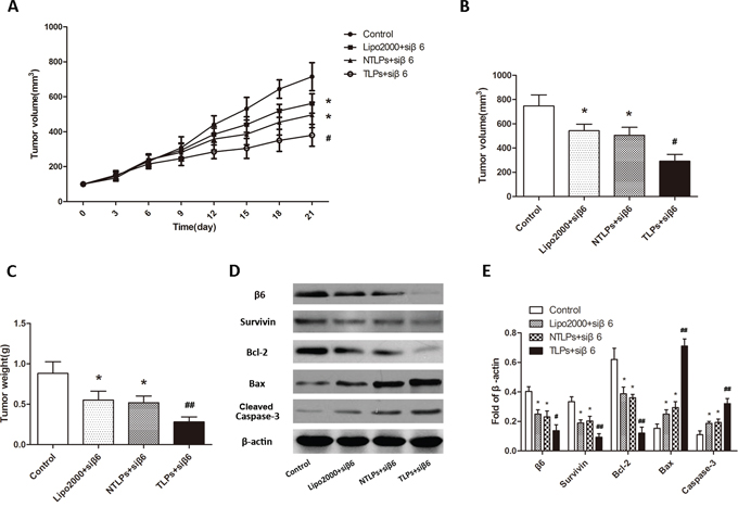 Figure 7: Anti-tumor efficiency of liposomes in HT-29 tumor-bearing nude mice after intravenous administration with β6-siRNA loaded Lipo2000, NTLPs and TLPs. A. Relative tumor volume time curve (n=5), *P < 0.05 compared with control, # P < 0.05 compared with NTLPs. B and C. Tumors were also measured and weighed. (n=5), *P < 0.05 compared with control,# P < 0.05, ## P < 0.05 compared with NTLPs. D and E. Western blot assays detected the expression of integrinβ6 and apoptosis related proteins, such as Survivin, Bcl-2, Bax and cleaved caspase-3 in tumor tissues. (D) Quantification of expression were also showed. The data are expressed as the means ± SD of three independent experiments, * P < 0.05, ** P < 0.01 compared with control, # P < 0.05, # # P <compared with NTLPs.