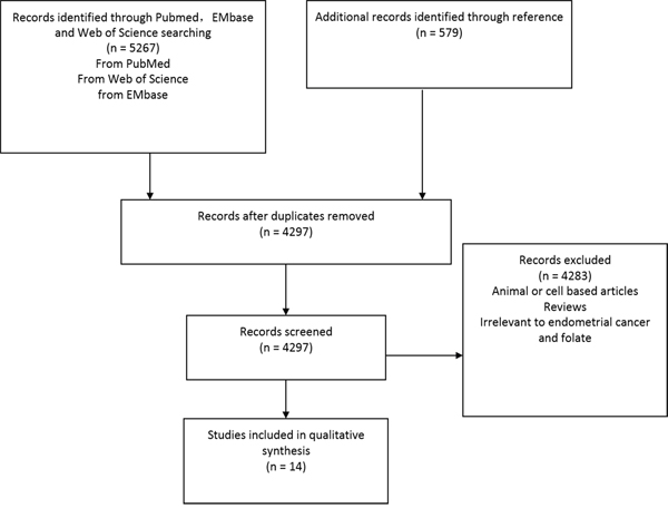 The search process was presented in Figure 1. From PubMed, EMbase, and Web of Science with key words of “folate” paired with “cancer” and “endometrial”, 5267 articles were screened. From references of articles and relevant reviews 579 more articles were identified. There were 1536 duplicates were removed and left 4297 articles. Among them, 4283 were excluded because they were based on animal or cell lines, or irrelevant. Fourteen studies were finally included in the current meta-analysis [13–26].