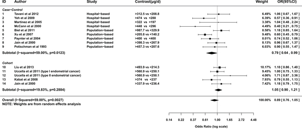 In the current study, a negative association between folate intake and risk of endometrial cancer was observed in case-control studies. Since the difference of mean lnOR between case-control studies and cohort studies kept significant and relative stable among all three categories, recall bias inherited in the retrospective study might contribute to that deviation. When patients recalling their dietary, they tended to underestimation of folate intake and overestimation of protective effect of folate, especially for five population-based case-control studies.