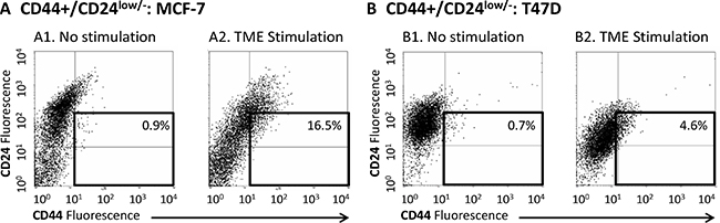 In our previously published studies [40, 41] we demonstrated that combined TME Stimulation (for three days in culture) has increased the proportion of cells with the CD44+/β1+ phenotype in Luminal-A MCF-7 cells from 12.5 ± 3% to 44.3 ± 17.7% (range 23–63%) and in T47D cells from 5.1 ± 1.6 to 20.7 ± 5.7 (range 18–27%) (for the sake of clarity, the summary of these findings is presented in Supplementary Figure S1). The CD44 molecule is predominantly involved in adhesion, but also characterizes the CSC sub-population in human breast cancer, denoted by the CD44+/CD24low/− phenotype. Therefore, we determined the impact of TME Stimulation on the proportion of CD44+/CD24low/− cells and found that exposure to TME factors increased the proportion of the CD44+/CD24low/− sub-population in MCF-7 cells from 0.9±0.5% (range 0.2–1.6%) to 13.8 ± 6.9% (range 7.1–25.6%) (Figure 1A; Supplementary Figure S2A1), and in T47D cells from 0.3 ± 0.3% (range 0.1–0.7%) to 5.5 ± 2.1% (range 4.0–7.9%) (Figure 1B; Supplementary Figure S2A2) (The impact of TME Stimulation on the expression of CD24 alone in MCF-7 an T47D cells is demonstrated in Supplementary Figure S2B).