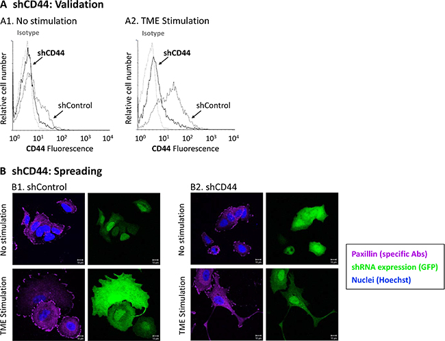 Figure 4: CD44 knock-down interferes with TME-induced cell spreading. MCF-7 breast tumor cells were infected by a GFP-shCD44-2 plasmid or by a GFP-shControl plasmid. As the plasmid did not contain a selection marker, infected cells were distinguished by GFP expression. Infected cells were exposed to TME Stimulation (as in Figure 1). No stimulation = Cells grown with vehicles only. (A) CD44 Knock-down validation. CD44 surface expression was determined by FACS analyses, using fluorescently-labeled specific Abs. Isotype = Isotype-matched Abs used as control. (A1) Non-stimulated cells. (A2) Cells exposed to TME Stimulation. (B) Cell morphology and paxillin localization, detected by specific Abs (purple). Cell nuclei were visualized by Hoechst staining (blue). Cells in which CD44 was knocked-down express GFP (green). Isotype-matched Abs were used as control, in order to determine baseline staining (Data not shown). (B1) Cells infected with the GFP-shControl plasmid. (B2) Cells infected with the GFP-shCD44-2 plasmid. Bar = 10 μm. In all panels, the results are from a representative experiment of n > 3, showing similar results. Photos of cell morphology, detected by light microscopy, are included in Supplementary Figure S5.