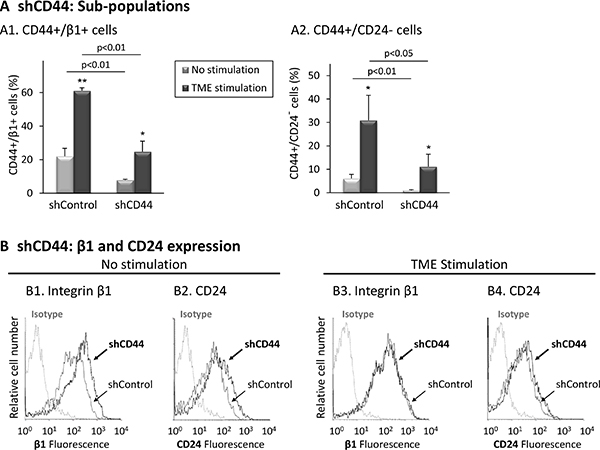 Figure 5: CD44 knock-down reduces the proportions of the TME-enriched CD44+/β1+ and CD44+/CD24- sub-populations. Following the procedure described in Figure 4, expression levels of surface markers were determined by FACS analyses, using fluorescently-labeled specific Abs. Isotype = Isotype-matched-Abs used as control. (A) Proportions of sub-populations. (A1) CD44+/β1+ cells. (A2) CD44+/CD24- cells [Due to GFP expression, the fluorophores of the Abs used for flow cytometry were replaced, leading to lower CD24 staining signals. As a consequence, the usual setting of CD24 axes gave rise to non-proportionately high levels of CD24low/− cells and were set again to distinguish only CD24- (CD24-negative) cells]. *p < 0.05, **p < 0.01 for differences between TME-stimulated and non-stimulated cells. The panel sums up the results obtained in n = 3 independent repeats. A representative experiment of n = 3, showing similar results, is demonstrated in Supplementary Figure S6. (B) Expression of integrin β1 and CD24. (B1, B2) Non-stimulated cells. (B3, B4) Cells exposed to TME Stimulation. The results are from a representative experiment of n = 3, showing similar results. Average expression values ± SD and statistics are provided in Supplementary Figure S6C.