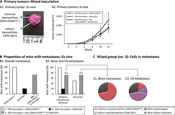 Figure 9: Mixed inoculation of TME-enriched CD44+/CD24low/- and CD44+/β1+ cells further supports the key roles of CD44+/CD24low/- cells in metastasis. CD44+/CD24low/− cells and CD44+/β1+ cells were sorted out from TME-Stimulated mCherry- or mPlum-expressing MCF-7 cells, respectively. Three groups of cells were injected (procedure as in Figure 8) to mice: Group 1 - CD44+/CD24low/−cells; Group 2 - CD44+/β1+ cells; Group 3 - mixture of both cell types in a 1:1 ratio. In all three groups, the total number of inoculated tumor cells was the same. Primary tumors and metastases were followed for 12 weeks, as described in Figure 8. (A) Development of primary tumors. (A1) An image of a resected primary tumor from a mouse of Group 3, demonstrating mCherry-expressing cells derived from sorted CD44+/CD24low/− cells and mPlum-expressing cells derived from sorted CD44+/β1+ cells. (A2) Average sizes of primary tumors ± SEM are presented in mm3, followed every two weeks by caliper measurements (p > 0.05, ANOVA). (B) Metastases detected ex vivo by the CRi Maestro™ device. (B1) Proportions of mice that developed metastases in all excised organs. A significant difference was not expected in this cohort size, yet the differences between the three groups were close-to-significant (p = 0.056, Fisher’s Exact Test). (B2) Proportions of mice that developed metastases in bones (left) and LNs (right). The differences between the three groups for bone metastases were close-to significant (p = 0.056, Fisher’s Exact Test), and the differences between the three groups for LN metastases were significant (p = 0.042, Fisher’s exact test). (C) Type of metastatic cells found in bones and LNs of mice of Group 3 (inoculated with a 1:1 mix of both sub-populations). (C1) Bone metastases. (C2) LN metastases. All panels sum up results obtained in n = 2 experimental repeats in which tumor cells were inoculated to a total of n = 8–11 mice (please see comments on mice numbers and statistics in “Materials and methods”).