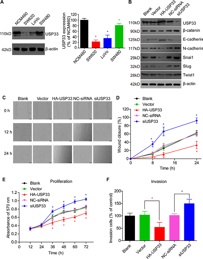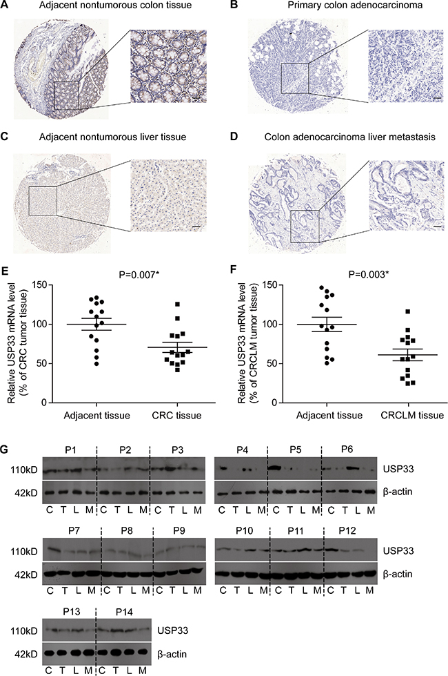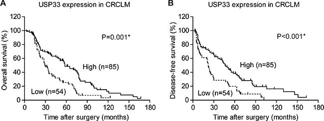 In the current study, we explored the expression pattern of USP33 in CRC and CRCLM tissues from patient who underwent resection of primary colorectal tumor as well as liver metastases. Our results showed that the expression level of USP33 in CRCLM, other than that in primary CRC, can act as an independent prognostic factor for the OS and DFS. In addition, in vitro study also demonstrated the role of USP33 in down-regulating cell proliferation, migration, and invasion.