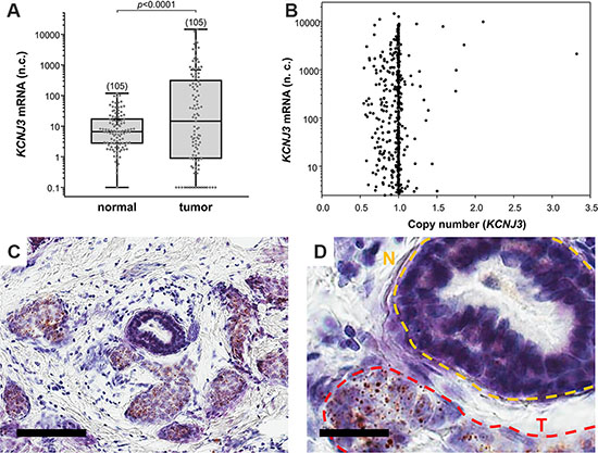 Figure 1: KCNJ3 mRNA levels are higher in tumor than in surrounding normal tissue. (A) KCNJ3 mRNA expression in normal and corresponding tumor tissue of breast cancer patients of the TCGA. Whiskers represent the lowest and the highest value, single data points are shown by grey circles, the black + marks the mean value. Number of samples analysed is given in brackets above each box. A Wilcoxon signed rank test was used for analysis (p < 0.001); n.c.: normalized counts. (B) KCNJ3 gene copy numbers versus KCNJ3 mRNA expression of breast cancer patients of the TCGA (n = 890). A copy number of 1.0 indicates that no gene amplification or deletion on DNA level has happened. Spearman rank correlation analysis revealed no statistical significant increase or decrease in KCNJ3 gene copy number (rS= -0.0207; not significant); n.c.: normalized counts. (C) KCNJ3 RNA in situ hybridization of a patient sample with high KCNJ3 expression. Positive signals (brown spots) are present in tumor cells only. Scale bar: 100 μm. (D) Detail of (C). N (yellow): normal duct; T (red): tumor area. Scale bar: 25 μm.