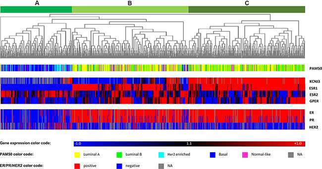 Figure 4: Heatmap of hierarchical cluster analysis. Hierarchical cluster analysis of mRNA levels of KCNJ3 and the estrogen receptors α (ESR1), β (ESR2), and GPR30 (GPER). The gene expression relative to the median expression value across all samples is shown (blue: values below median; red: values above median). PAM50 classification (multicolor panel) and pathological ER, PR and Her2 expression status (blue: negative; red: positive) are given for each patient sample. The dendrogram on top shows that patients were divided into three main branches (A, B and C) based on the expression levels of the four genes analyzed.