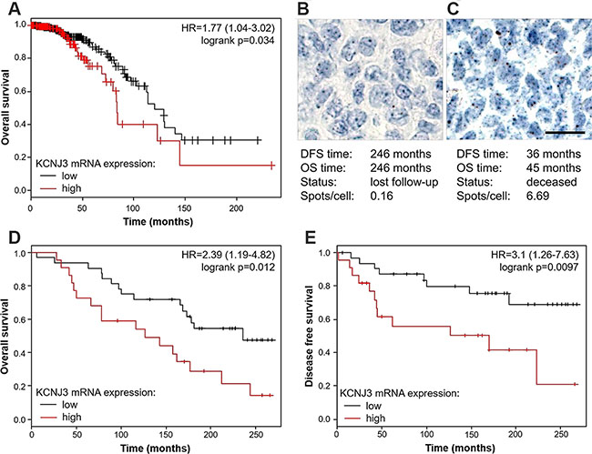 Figure 5: Estrogen receptor positive patients with high KCNJ3 mRNA levels in their tumor have a worse overall and disease free survival probability. (A) Kaplan-Meier plot showing overall survival of ER positive patients of the TCGA data set with low and high KCNJ3 mRNA expression levels as determined by RNAseq (n = 647). (B) Representative RNA in situ hybridization of a patient with low KCNJ3 levels in the tumor (0.16 spots/cell) and long survival times. (C) Representative RNA in situ hybridization of a patient with high KCNJ3 levels in the tumor (6.69 spots/cell) and short survival times. (D) Kaplan-Meier plot showing overall survival of a subset of patients of the GEO data set GSE17705 with low and high KCNJ3 mRNA expression levels as determined by RNA in situ hybridization (n = 54). (E) Same as (D), but showing disease free survival. Hazard ratios and logrank p-values are given in Kaplan-Meier plots. Scale bar in (B) and (C): 20μm. DFS: disease free survival; OS: overall survival.