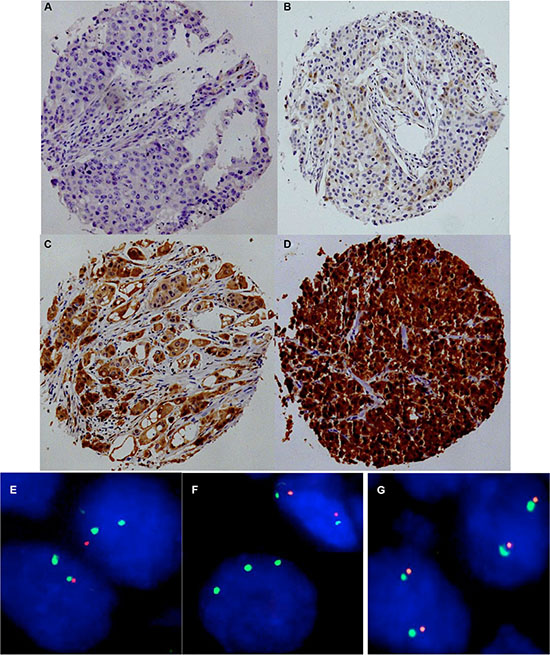 Figure 1: Representative images of p16 immunostaining with (A) negative, (B) weak, (C) moderate, and (D) strong staining and examples of FISH findings using the 9p21 deletion probe. (E) Heterozygous deletion as indicated by the lack of one orange 9p21 signal and two green centromere 9 signals, (F) Homozygous deletion as indicated by the complete lack of orange 9p21 signals in the tumor cell, (G) Normal 9p21 copy numbers as indicated by two orange 9p21 signals and two green centromere 9 signals.