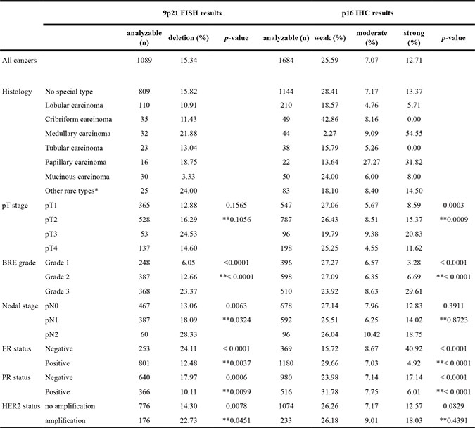 Association of p16 expression and 9p21 deletion to breast cancer phenotype