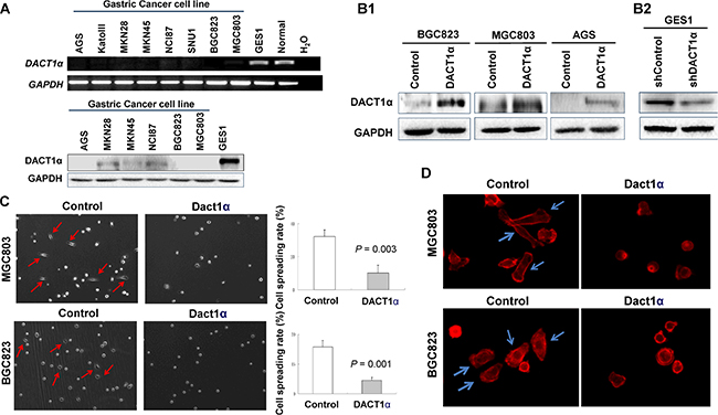 Figure 1: DACT1α suppressed cell spreading and F-actin formation. (A) DACT1α expression was silenced in all gastric cancer cell lines, but expressed in normal human epithelial cell line GES1 and in normal gastric tissues. (B1) Ectopic expression of DACT1α in BGC803, MGC823 and AGS cell lines was confirmed by Western blot (cropped gel). (B2) Knockdown effect of DACT1α by shDACT1α in normal gastric epithelial cell line GES1 was confirmed by Western blot (cropped gel). (C) pcDNA3.1-DACT1α vector stably transfected BGC823 and MGC803 cells were significantly slowed the spreading rate on cover slips for 6 hours compared to control vector pcDNA3.1 transfected and BGC823 and MGC803 cells. (D) BGC823 and MGC803 cells stained with rhodamine-phalloidin for detecting F-actin formation.