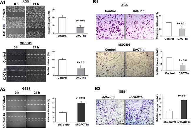 Figure 2: DACT1α inhibited gastric cancer cell migration and invasion ability. (A1) Cell migration rates of pcDNA3.1 and pcDNA3.1-DACT1α vector transfected AGS and MGC803 cells were compared via wound healing assays. (A2) Knockdown of DACT1α by shDACT1α promoted wound healing closure rate. Microscopic observation was recorded at 0 and 24 hours after scratching the surface of a confluent layer of cells. (B1) Invasion rates of pcDNA3.1 and pcDNA3.1-DACT1α vector transfected AGS and MGC803 cells. (B2) Knockdown of DACT1α by shDACT1α promoted GES1 cell invasion. Number of cells that invaded through the Matrigel was counted in 10 fields under the ×20 objective lens.