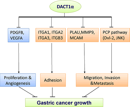 Figure 4: The molecular mechanisms underlying the tumor suppression of DACT1α in gastric cancer. Schematic diagram for the molecular basis of DACT1α as a tumor suppressor gene in gastric cancer. Ectopic expression of DACT1α suppressed gastric cancer cell growth was associated with several biological effects: 1) Suppression of PDGFB and VEGFA contributed to dampened cell proliferation and angiogenesis. 3) DACT1α mediated cell spreading adhesion, migration and invasion inhibition were associated with the suppression of ITGA1, ITGA2, ITGA3, ITGB3, MCAM, MMP9 and PLAU.