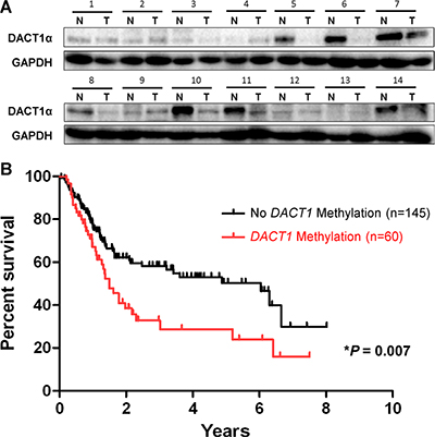 Figure 5: Kaplan-Meier survival curves show that gastric cancer patients with DACT1α methylation had poorer survival than those without DACT1α methylation. (A) Expression of DACT1α protein was significantly down-regulated in GC tumor tissues compared to adjacent non-tumor tissues (n = 14) (normalized to GAPDH) (cropped gel). (B) Patients with DACT1α hypermethylation had poor survival rate than those without methylation (U) based on the log-rank test (P = 0.007).