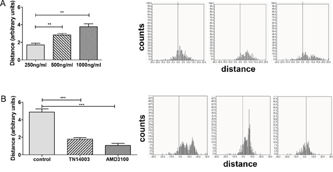 Figure 1: CXCR4 antagonists inhibit CXCL12-induced cell migration. A. Migration of SCLC cells towards CXCL12 gradient was evaluated by a 3D chemotaxis assay. The bars represent the mean relative migration of cells towards different CXCL12 concentrations ±SD (n=3). B. Cells were treated with PBS or the CXCR4 inhibitors TN14003 (5 μM) or AMD3100 (100 nM). The bars represent the mean relative migration of cells towards CXCL12 (1000 ng/ml) ±SD (n=3). The corresponding trajectories on the right panel illustrate the covered distance at the x axis.