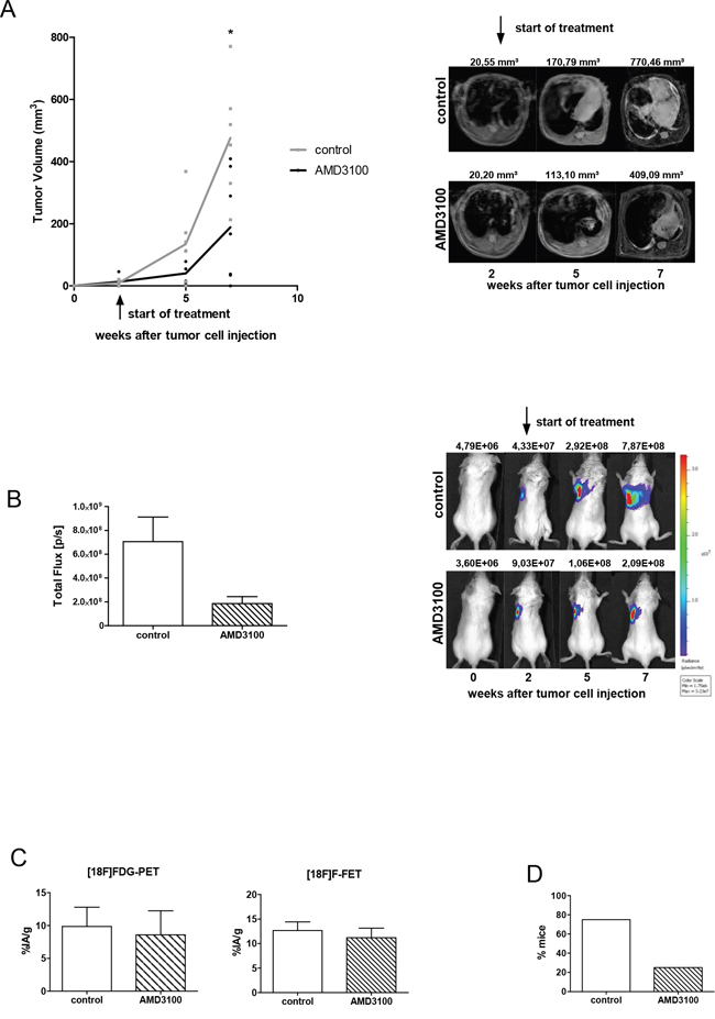 Figure 2: AMD3100 reduces the growth of the primary tumor and metastasis formation. A. Tumor-bearing mice were treated twice a day with PBS vehicle control or 2.5 mg/kg AMD3100, starting at day 14 after tumor inoculation (control group n=7; treated group n=6). Treatment continued for five weeks. One representative result out of three independent experiments is shown. The corresponding MR images are illustrated on the right panel. B. Treatment with AMD3100 reduces the progression of vital tumor cells at the terminal point. Right panel: representative BL images of control and AMD3100-treated mice at indicated time points. C. PET scan analysis displayed no difference in metabolic activity of tumor cells in the control (n=3) and AMD3100-treated group (n=3). D. AMD3100 treatment suppresses formation of metastases. Data are shown as percentage of mice which developed spontaneous metastases (treated group n=11 and controls n=10).