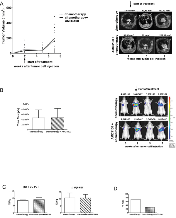 Figure 4: Combination of chemotherapy and AMD3100 shows antimetastatic effect. A. At days 14 and 21 after tumor inoculation Rag2-/-γc-/- mice were treated with a combination of cisplatin (5 mg/kg body weight) and etoposide (30 mg/kg body weight). Starting 2 weeks after inoculation, animals were additionally treated twice a day with PBS or 2.5 mg/kg AMD3100 for five weeks (control group n=9; treated group n=9). No difference in the growth of primary tumors was observed. B. Progression of vital tumor cells and representative evaluation of the BLI in chemotherapy and combination group. C. PET scan analysis displayed equal uptake of radiotracers in both groups (n=3 per group). D. Effect of AMD3100 addition on the formation of metastases. Data are shown as percentage of mice showing spontaneous metastases (n=7 per group).