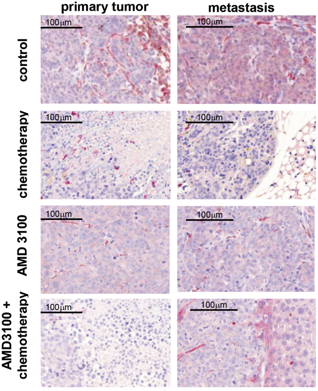 Mouse organs were formalin fixed and paraffin embedded using routine protocols. Microscopic sections were 3 μm thick. Of tumor bearing tissues immunhistochemical double stains CXCR4 (abcam 1:200) and CXCL12 (R&D systems 1:50) were made.