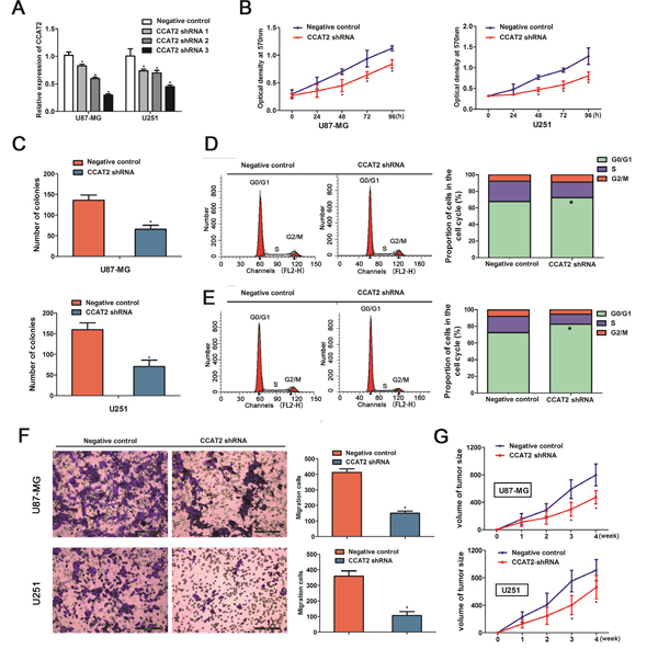 Figure 2: Knockdown of CCAT2 in glioma cell lines suppressed cell proliferation, cell cycle progression and migration of glioma cells. A. The Knockdown effects of CCAT2 were measured by qRT-PCR in glioma cells transfected with shRNAs or its negative controls. Representative results for cell proliferation rate were evaluated by using CCK-8 B. and colony formation C. assays at the indicated days. The two-sided Student’s t-test was used to calculate P value. Representative micrographs (left) and quantification (right) of U87-MG cells D. and U251 cells E. transfected with shRNA or its negative control by flow cytometric analysis with PI staining. F. Cell migration was inhibited by the effect of CCAT2 knockdown in the indicated glioma cells. Results are represent as mean±SD (Two-sided Student’s t-test; n=3, P=0.011 for U87-MG cells and P=0.014 for U251 cells, compared with controls, respectively). G. Tumor volumes were measured in CCAT2-shRNA groups and negative control groups. Downregulated of CCAT2 significantly inhibited tumor growth in vivo. Results are represent as mean±SD (Two-sided Student’s t-test was used; n=6, P=0.010 for U87-MG cells and P=0.018 for U251 cells, compared with controls at the fourth week).
