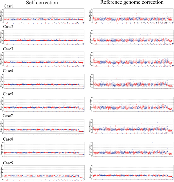 We selected 9 previous known triploids SNP array karotype to validate using NGS. The 9 triploid SNP array kayotype were shown in Supplementary Figure 1, one was amplification failure in our study. The basic information of 9 sample data was shown in Supplementary Table 1. After sequencing, we firstly using reference karyotype methods to analyzed the data, and we found that NGS could not detect triploid for it considered the triploid as normal diploid (Supplementary Table 2). Then we using self correction method to analyze the data, this could not detect the triploid karyotype (See Figure 3). The unique reads of NGS data were ranging from 1.23M to 4.84Mb, both the low and high coverage didn’t identify the triploidy in our study. Our results indicated that both self and reference correction may not be able to detect the triploid, mostly because both these methods calculated the reads of 24 chromosome falling into the continuous sliding widows on human reference genome.
