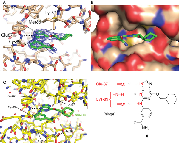 As a starting point for understanding the mode of binding of arylaminopurines to Nek2, the X-ray crystal structure of 8, identified from the initial screening, was determined in complex with Nek2 and revealed that the compound binds via a hydrogen bonding triplet between the purine N9-H, N3 and C2-NH, and the kinase hinge region residues Cys-89 and Glu-87 (Figure 1). Alkylation or removal of the participating purine nitrogen atoms would, therefore, be expected to be detrimental to activity towards Nek2 as for CDK2 and offer no basis for differentiation. However, the 6-alkoxy substituent was considered a candidate for remodeling of prototype inhibitors to differentiate between Nek2 and CDK2 inhibition. The 6-cyclohexylmethyl group occupies a lipophilic cavity near the ribose-binding pocket in CDK2 and is critical for activity [20]. A van der Waals contact may be formed between the 2-arylamino group and Gly-92. No definite interactions were observed between the amide functionality of 8 with the binding site, although the amide group is close to Asp-93 (Figure 1C), and it was considered that this may be exploitable.