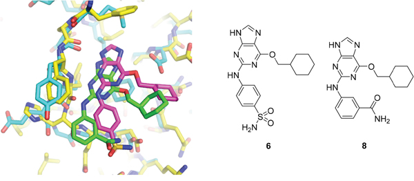 Figure 2: Structural overlay of 8-T175A-Nek2A complex (green and cyan) and the 6-T160pCDK2-cyclin A (pink and yellow). Rotation of the 2-arylamino group with respect to the purine is only observed for 6 in CDK2, but not for 8 in Nek2.