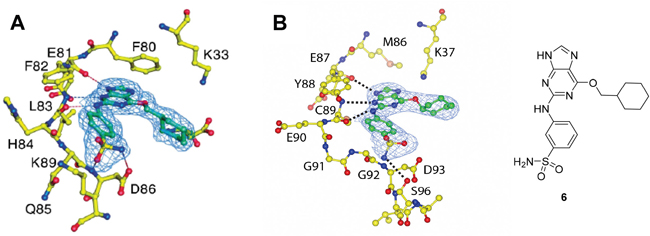 Figure 3: Binding of purine 6 to: A. active Thr 160-phosphorylated CDK2-cyclin A complex (T160pCDK2-cyclin A); and B. inactive Nek2.