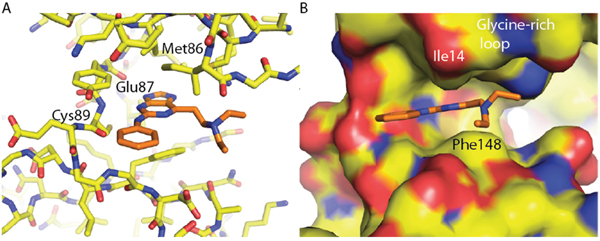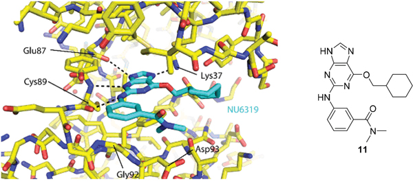 Figure 8: Crystal structures of compound 71 in complex with Nek2. A. Interaction of 6-(2-aminovinyl)purine derivative 71 (carbon atoms coloured orange) with the hinge region of Nek2. B. Orientation of the C-6 substituents towards the glycine-rich loop.
