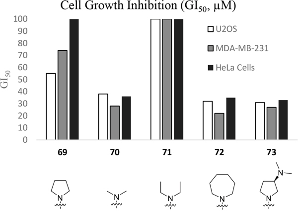 Figure 6: Growth inhibition (GI50) of selected cell-lines by enamines 69-73.