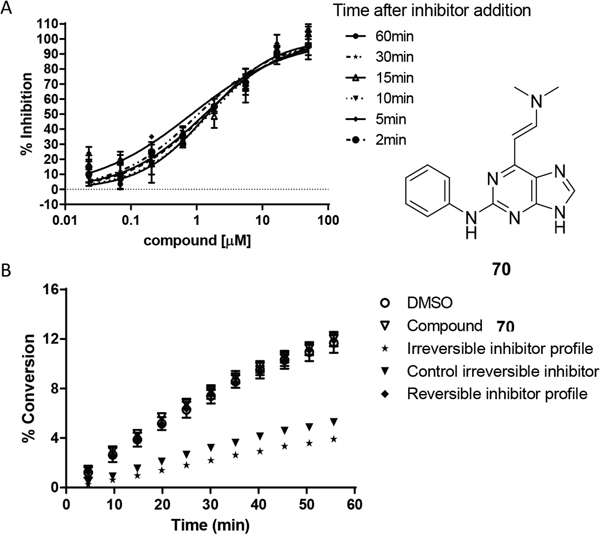 Figure 7: Mechanism of action studies with enamine 70. A. The effect of pre-incubation (2-60 min) of Nek2 with 70 on inhibitory potency. B. Reversibility studies indicating that 70 was not an irreversible inhibitor of Nek2 (Supplementary Table 4).