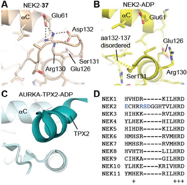 In crystal structures of Nek2 bound to purine inhibitors, the region C-terminal to the αE helix and N-terminal to the HRD motif is ordered (Figure 11A), unlike other structures of Nek2 (Figure 11B). The loop structure contacts the αC-helix in the N-lobe of the protein and occupies the equivalent space as the activatory helix of TPX2 in the Aurora-A/TPX2 complex (Figure 11C). Based on these observations, we predict that this loop will fulfill a similar role in the stabilization of the activation loop in the active Nek2 structure. This loop is not present in other Neks and is indeed unique to Nek2 among human kinases (Figure 11D). Importantly, targeting this unique protein conformation with small molecules presents an attractive opportunioty for selective inhibition of Nek2 over other kinome members.