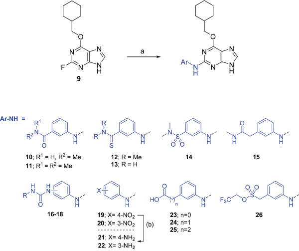 Investigation at the purine 2-position began with the synthesis of simple 2-arylamino purine derivatives containing hydrogen-bond donors/acceptors, in which the substitution pattern around the aryl ring was varied and the linker length between the ring and various functionalities was altered. From the initial screening data, several structural motifs at this position showed Nek2 inhibition, including carboxamides, sulfonamides and ureas. These served as the targets for synthesis. Initial compounds were prepared by direct nucleophilic aromatic substitution of a purine 2-fluoro substituent of 9 with a range of anilines (see supporting information for synthesis of corresponding anilines where otherwise not shown); a second approach allowed diversification of some of these simple 2-arylamino-purines.
