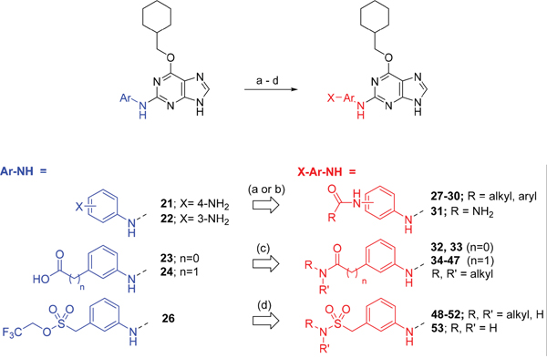 As indicated, para- and meta-aminophenylaminopurines 21 and 22 (Scheme 1) were treated with acyl chlorides to provide the desired N-acyl aniline ‘reversed amide’ derivatives 27-30 without purine N-9 protection (Scheme 2). In addition to the desired products, the reaction also afforded an unstable acylation product at the purine N-9, which was easily removed by treatment with TFA. This allowed the investigation of the exact preferences for the amide group orientation, as well as the substitution position at the 2-arylamino group. To investigate whether a second hydrogen bond-donor group could form additional favourable interactions over that of a simple carboxamide and to quantify this in comparison with more complex urea derivatives, the parent urea e.g. 31 was prepared. Arylureas were synthesised by treatment of precursor aniline 22 with isocyanic acid (HN=C=O), generated in situ from sodium cyanate and TFA (Scheme 2) [24]. As previously observed within the reversed amides series, an undesired urea product was also formed at the purine N-9 and was cleaved by treatment with TFA.
