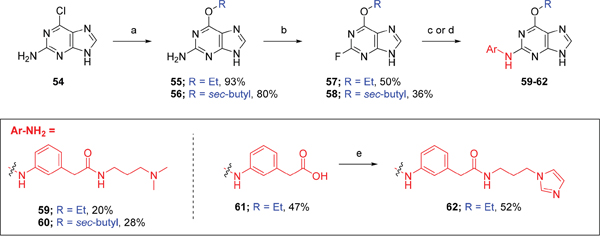 Purines bearing O6-alkyl substituents, ethyl and sec-butyl (59 and 60, respectively), were prepared from the 6-chloropurine precursor (54), by 6-position substitution with alkoxides, followed by addition of anilines at the 2-position that had been found to confer Nek2 inhibition (Scheme 3). To overcome some purification problems encountered during the synthesis of purines with dimethylaminopropyl side chains, carboxylic acid 61 was synthesized and used without further purification in the preparation of 1-(3-aminopropyl)imidazole derivative 62.
