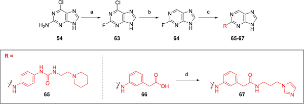 To provide a reference point for these studies, the 6-substituent was deleted entirely. Thus, the 6-unsubstituted intermediate 64 was prepared from 2-fluoro-6-chloropurine (63) [27], by selective dehalogenation of the 6-chloro group using catalytic transfer hydrogenation [28, 29]. Coupling of 64 with the appropriate anilines gave derivatives 65 and 66, with 66 being converted to amide 67 (Scheme 4).