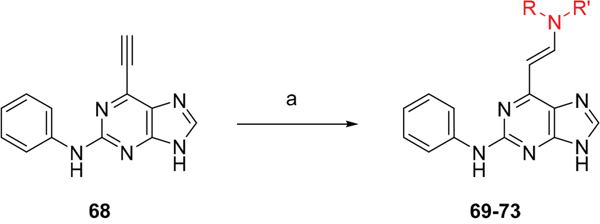 Scheme 5: Synthesis of 6-(dialkylamino)vinyl-purines.a a Reagents and conditions: (a) RR′NH, THF, microwave 100 °C, 10 min, 60 – 98% (Supplementary Table 1).