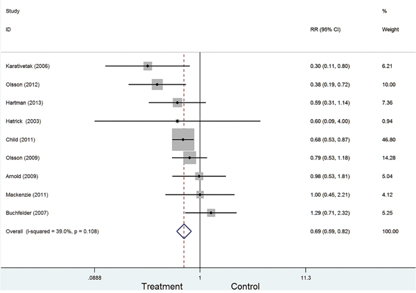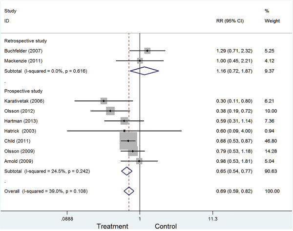 Figure 2 presented the combined the results from the fixed-effects model. In totally, 11191 study subjects were included in the analysis. The results suggested that GH replacement therapy was associated with the deceased risk of cancer in adult with GHD (RR=0.69, 95%CI: 0.59-0.82), with low heterogeneity across studies (I2=39.0%, P=0.108).