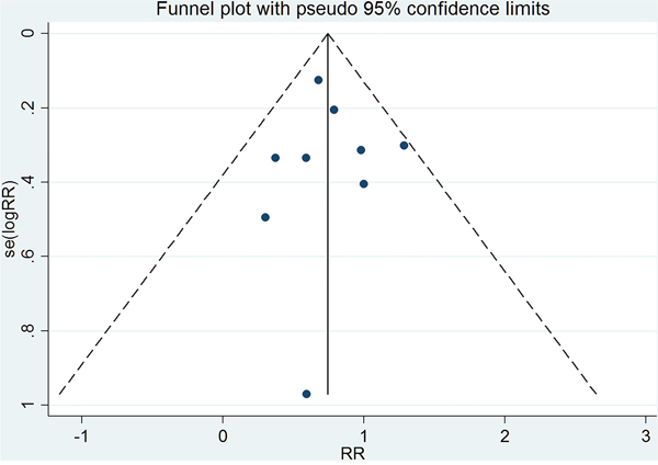 We performed a sensitivity analysis by sequentially omitting one study each time, and the pooled RRs did not materially change, indicating that our results were statistically stable (Figure 4).