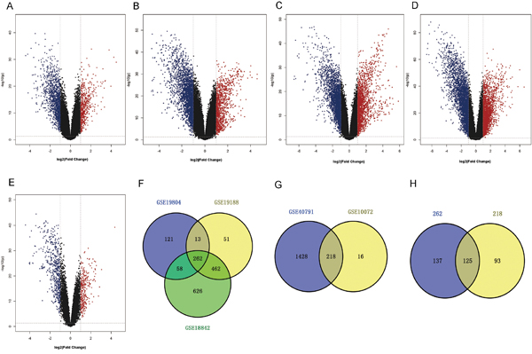 Figure 1: Identification of expression differences between tumor and NTL. A-E. Volcano plot of the differential mRNA expression analysis. X-axis: log2 fold change; Y-axis: - log10 (FDR P-value) for each probes; Vertical dotted lines: fold change ≥ 2 or ≤ 2; Horizontal dotted line: the significance cutoff (FDR P-value = 0.05). (A) There were 1,388 genes identified to be differentially expressed in GSE19804, including 454 up-regulated and 934 down-regulated genes. (B) 2,421 genes (788 up-regulated and 1,633 down-regulated genes) differentially expressed in GSE19188. (C) 3,168 genes (1,403 up-regulated and 1,765 down-regulated genes) differentially expressed in GSE18842. (D) 3,796 genes (1,646 up-regulated and 2,150 down-regulated genes) differentially expressed in GSE40791. (E) 666 genes (234 up-regulated and 432 down-regulated genes) differentially expressed in GSE18842. F-H. Overlap analysis between different datasets. (F) A total of 262 genes were significantly differentially expressed in the three NSCLC datasets. (G) 218 genes were overlapped in the two LUAD datasets. (H) There were 125 overlapping genes significantly differentially expressed between tumor and NTL in all five datasets.
