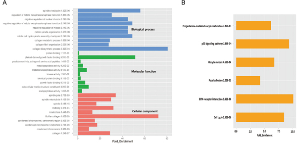 To determine biological functions of the 125 DEGs, Gene Ontology (GO) analysis was performed. In terms of the three different domains of GO, genes associated with biological processes were mainly involved in cell cycle and mitosis, 5 of the top 10 enriched categories of molecular function were related to peptidase activity or kinase activity, while spindle and chromosome were the most enriched cellular components (Figure 2A, Supplementary Table S2). We further investigated the functional implication of these DEGs in the development of LUAD by Kyoto Encyclopedia of Genes and Genomes (KEGG) analysis. The results demonstrated that DEGs were enriched in six KEGG pathways. Cell cycle was the most significant one (P =1.52× 10−6), followed by ECM-receptor interaction (P = 9.62× 10−6), p53 signaling pathway (P = 3.66× 10−4) (Figure 2B, Supplementary Table S3). Most of enriched functional catalogues and pathways have been found to be closely associated with the incidence and development of cancer, which emphasized an implication of the DEGs in LUAD. We also found that several genes were repeatedly involved in cell cycle and mitosis, including MAD2L1 and CDK1.