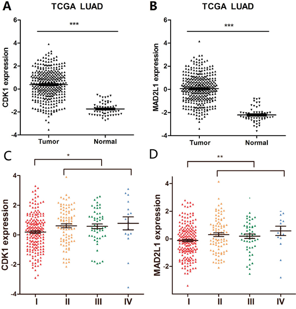 Figure 4: Validation of the differentially expressed genes. A. Validation of mRNA expression of CDK1 in TCGA datasets. B. Validation of mRNA expression of MAD2L1 in TCGA datasets. C. Gene expression of CDK1 in LUAD patients according to clinical stage. D. Gene expression of MAD2L1 in LUAD patients according to clinical stage. *** corresponds to P <0.001; ** P <0.01 and * P <0.05.