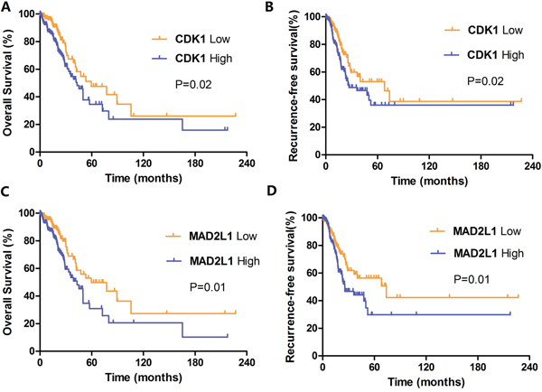 We next asked whether CDK1 and MAD2L1 expression will influence clinical outcomes of LUAD patients. As shown in Figure 5A and Figure 5B, CDK1 expression was significantly related with OS (P = 0.02) and RFS (P= 0.02) of LUAD patients. The median OS in CDK1 low expression group is 59.7 months, in CDK1 high expression group is 43.1 months. The median RFS in CDK1 low expression group is 68.2 months, in CDK1 high expression group is 26.9 months. Those figures meant that higher CDK1 expression indicated poorer prognosis and earlier recurrence. Similarly, elevated expression of MAD2L1 was both remarkably associated with reduced survival (P = 0.01; Figure 5C) and increased risk of recurrence (P = 0.01; Figure 5D). The median OS in low and high group of MAD2L1 is 59.7 months and 43.1 months. The median RFS in low and high group of MAD2L1 is 73.9 months and 25.7 months. In short, the overexpressed CDK1 and MAD2L1 have potentials to serve as prognostic biomarkers for prediction of LUAD recurrence and survival.