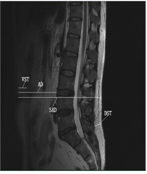 We measured adipose tissue diameters in four locations in the midsagittal plane from T2-weighted images. Sagittal diameter (SAD, cm) was defined as the horizontal distance between anterior skin and posterior skin at the umbilicus level [24]. Abdominal diameter (AD, cm) was defined as the distance from the abdominal subcutaneous fascia to the anterior border of the vertebral body at the same SAD level [25]. Ventral subcutaneous thickness (VST, cm) was the thickness of the subcutaneous adipose tissue at the same SAD and AD level [26]. Dorsal subcutaneous thickness (DST, cm) was defined as the distance between the anterior edge of the subcutaneous fat and the subcutaneous fascia in the L5 or S1 vertebral body perpendicular to the skin at the presacral level [15] (Figure 1).