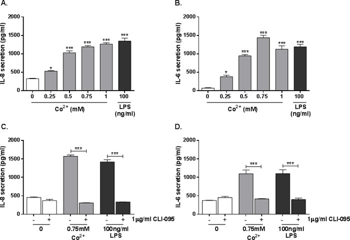 Figure 1: Effect of Co2+ ions and TLR4 activation on cytokine secretion by HMEC-1. A. & B. HMEC-1 were stimulated with 0.25-1mM Co2+ or 100ng/ml LPS. A. IL-8 and B. IL-6 secretion were assessed by ELISA. C. & D. HMEC-1 were pre-treated with 1μg/ml CLI-095 followed by 24h stimulation with 0.75mM Co2+ or 100ng/ml LPS. C. IL-8 and D. IL-6 secretion was quantified by ELISA. All data is representative of three independent experiments.