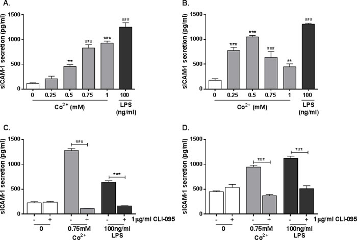 Figure 3: Effect of Co2+ and TLR4 activation on sICAM-1 secretion. A. HMEC-1 or B. MonoMac 6 cells were stimulated with 0.25-1mM Co2+ for 24h and sICAM-1 secretion was measured by ELISA. C. HMEC-1 or D. MonoMac 6 cells were pre-incubated with 1μg/ml CLI-095 for 6h before stimulation with 0.75mM Co2+ or 100ng/ml LPS. All data is representative of three independent experiments.