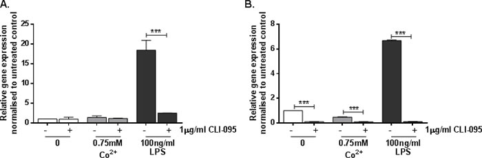 Figure 4: Effect of Co2+ and LPS on MMP9 expression. A. HMEC-1 or B. MonoMac6 cells were pre-treated with 1μg/ml CLI-095 for 6h prior to stimulation with 0.75mM Co2+ or 100ng/ml LPS for 24h. MMP9 expression was assessed by qRT-PCR. All data is representative of at least two independent experiments.