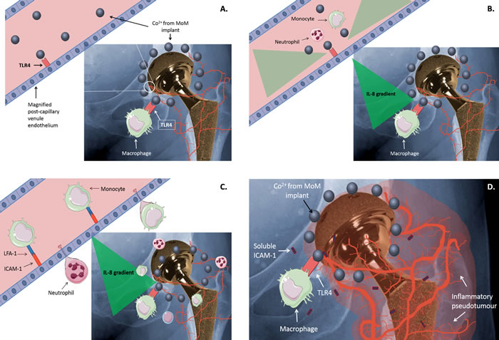Figure 5: Working model. A. Co2+ released from metal-on-metal (MoM) hip implants activates TLR4 on immune cells such as macrophages. B. Co2+-mediated TLR4 activation results in the release of inflammatory cytokines and chemokines, including IL-8, by macrophages and endothelial cells. The generated cytokine/chemokine gradient attracts circulating leukocytes, such as monocytes and neutrophils. C. Co2+ activation of TLR4 on endothelial cells increases expression of ICAM-1, which promotes leukocyte binding via interaction with LFA-1. This in turn drives leukocyte extravasation. D. Migrated leukocytes, together with sICAM-1 released by endothelial cells and macrophages, promote an inflammatory response that may contribute to inflammation and pseudotumour development around a MoM implant.
