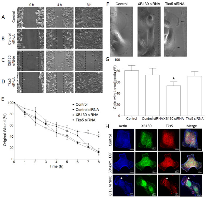 Figure 2: Tks5 is not essential for lamellipodia formation. A.-D. BEAS-2B cells were transfected with control (scrambled), XB130 or Tks5 siRNA and subjected to a wound-healing assay over an 8 h time course. Unlike XB130 down regulation, Tks5 down regulation does not inhibit wound closure. E. Percentage of original wound width per hour shows that only XB130 siRNA significantly reduces wound healing at 7 h and 8 h, as compared to control, control siRNA-transfected or Tks5 siRNA-transfected cells. F. High magnification phase contrast microscopy at the leading edge of wounds shows that control and Tks5 downregulated cells form dark ruffled edges (arrow), indicative of lamellipodia, whereas XB130 down-regulated cells appear to lack these structures (asterisk). G. Quantification of cells with lamellipodia at the leading edge shows that XB130 downregulation significantly reduced the percentage of cells displaying lamellipodia, as observed by phase contrast microscopy. Data is summarized from three independent experiments and presented as mean ± SD. * represents p < 0.01 compared with controls (non-transfected BEAS-2B cells and non-targeting siRNA-transfected cells). H. Co-immunofluorescence staining of XB130 (green), actin (blue) and Tks5 (red). BEAS2B cells were treated with or without 50 ng/mL EGF or 0.1 uM NNK. No treatment control shows normal stress fibers. EGF stimulation shows formation of lamellipodia as detected by actin bands at the cell periphery and XB130 staining. NNK stimulation shows the formation of lamellipodia and podosomes (white arrows) as detected by actin and Tks5. XB130 only translocates to lamellipodia after stimulation.