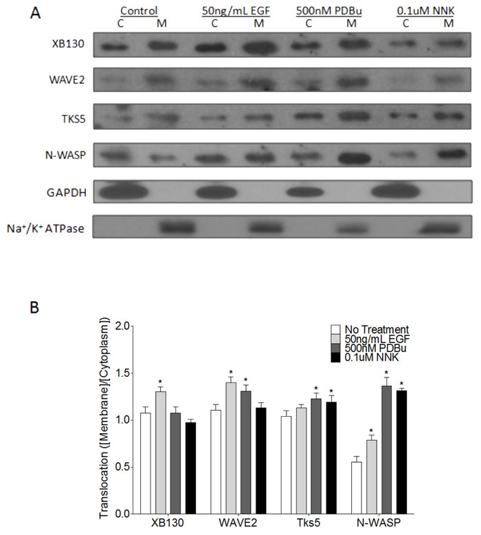 Extracellular stimulation mediates the translocation and protein-protein binding of scaffold proteins, like XB130 and Tks5, for the induction of specific signal transduction pathways and promotion of cell processes. To further confirm that stimulation induces differential expression and localization of XB130 or Tks5 to the cell periphery (Figure 1G & 2H), BEAS-2B cells were stimulated with either 50 ng/mL EGF, 500 nM PDBu, or 0.1 μM NNK, and whole cell lysates were fractionated into cytoplasm and cell membrane for immunoblot detection of XB130 and Tks5. Quantitation of XB130 intensity (normalized to the membrane marker Na+/K+ ATPase and cytoplasmic marker, GAPDH) showed that XB130 translocation to the cell membrane was significantly increased after EGF stimulation, as compared to PDBu and NNK stimulation (Figure 3B). These changes were very similar to the translocation of WAVE2 (Figure 3B), a marker for lamellipodia. In contrast, PDBu and NNK stimulation significantly increased translocation of Tks5 to the cell membrane (Figure 3B), which was similar to translocation of N-WASP, a marker of podosomes (Figure 3B).